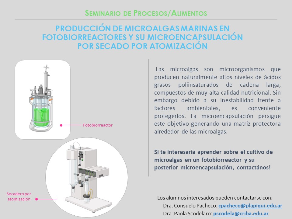 Título del Seminario: "Producción de Microalgas Marinas en Fotobiorreactores y su Microencapsulación por Secado por Atomización".