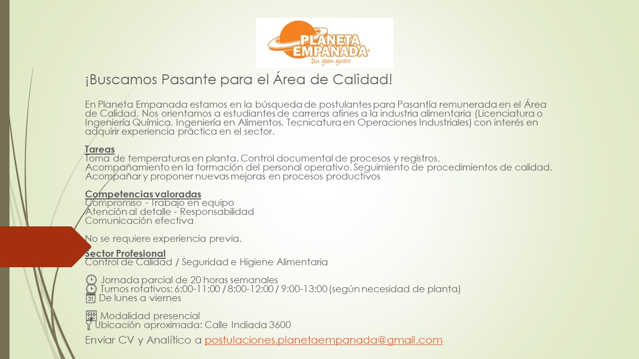 Se encuentra abierta una búsqueda de postulantes para Pasantía remunerada en el Área de Calidad, de Planeta Empanadas.
