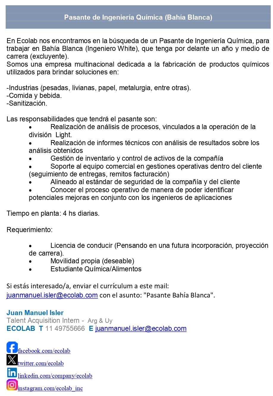 En Ecolab nos encontramos en la búsqueda de un Pasante de Ingeniería Química, para trabajar en Bahía Blanca (Ingeniero White), que tenga por delante un año y medio de carrera (excluyente).